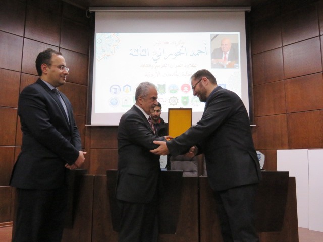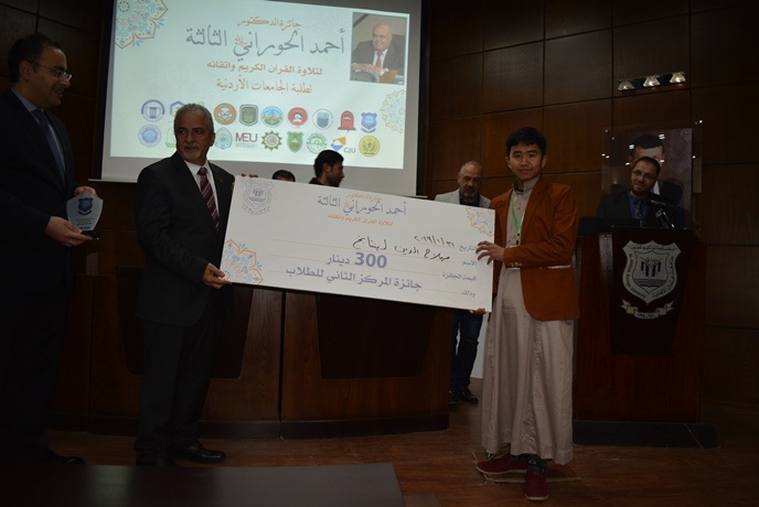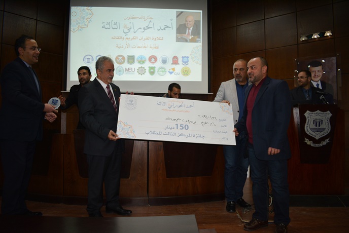 سرايا - برعاية الأستاذ الدكتور ساري حمدان رئيس جامعة عمان الأهلية نظمت عمادة شؤون الطلبة فعاليات جائزة الدكتور أحمد الحوراني –رحمه الله- الثالثة لتلاوة القرآن الكريم واتقانه لطلبة الجامعات الأردنية يوم الخميس الموافق 31/1/2019 في مدرج نزار قباني داخل حرم الجامعة.