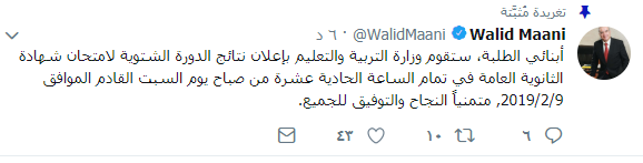 سرايا - قال وزير التربية والتعليم والتعليم العالي، الدكتور وليد المعاني، إن وزارة التربية والتعليم ستقوم بإعلان نتائج الدورة الشتوية لامتحان شهادة الثانوية العامة في تمام الساعة الحادية عشرة من صباح يوم السبت القادم الموافق 2019/2/9.