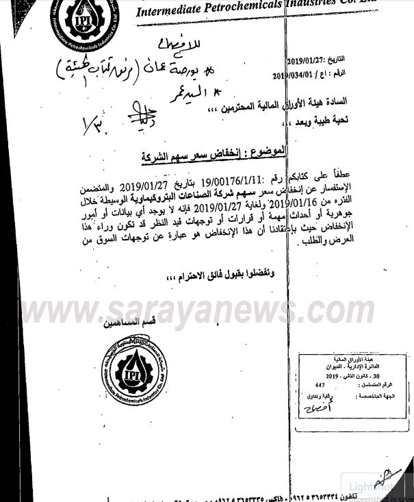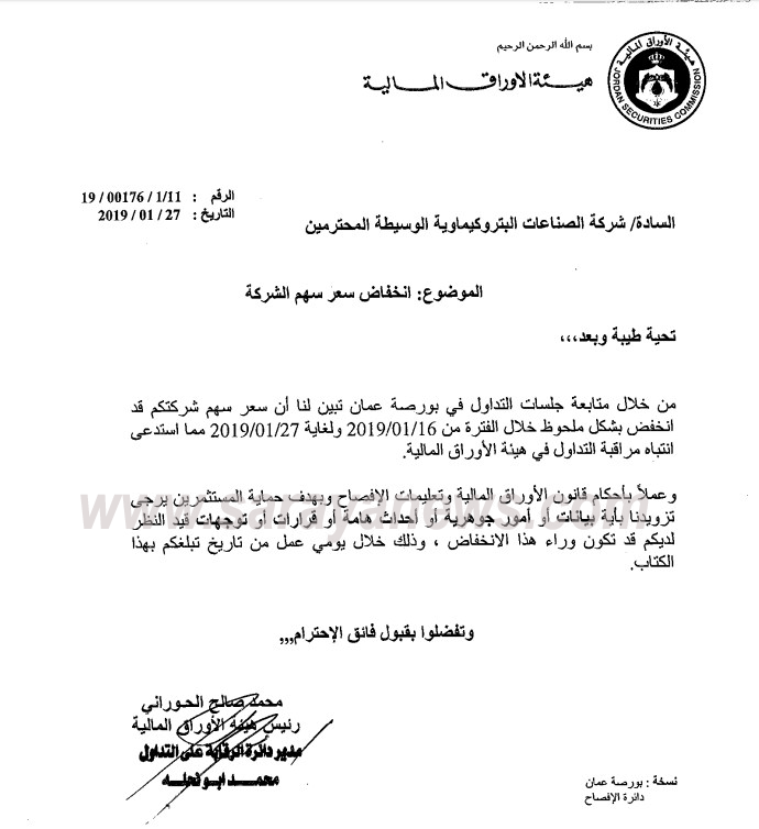 وبينت الوثيقة التي تحمل الرقم 11/1/00176/19 والمؤرخ بـ 27/1/2019 ، والموجه من هيئة الاوراق المالية للشركة انه من خلال متابعة جلسات التداول في بورصة عمان تبين ان سعر اسهم شركة الصناعات البتروكيماوية انخفض بشكل ملحوظ خلال الفترة من 16/1/20198 ولغاية 27/1/2019 .