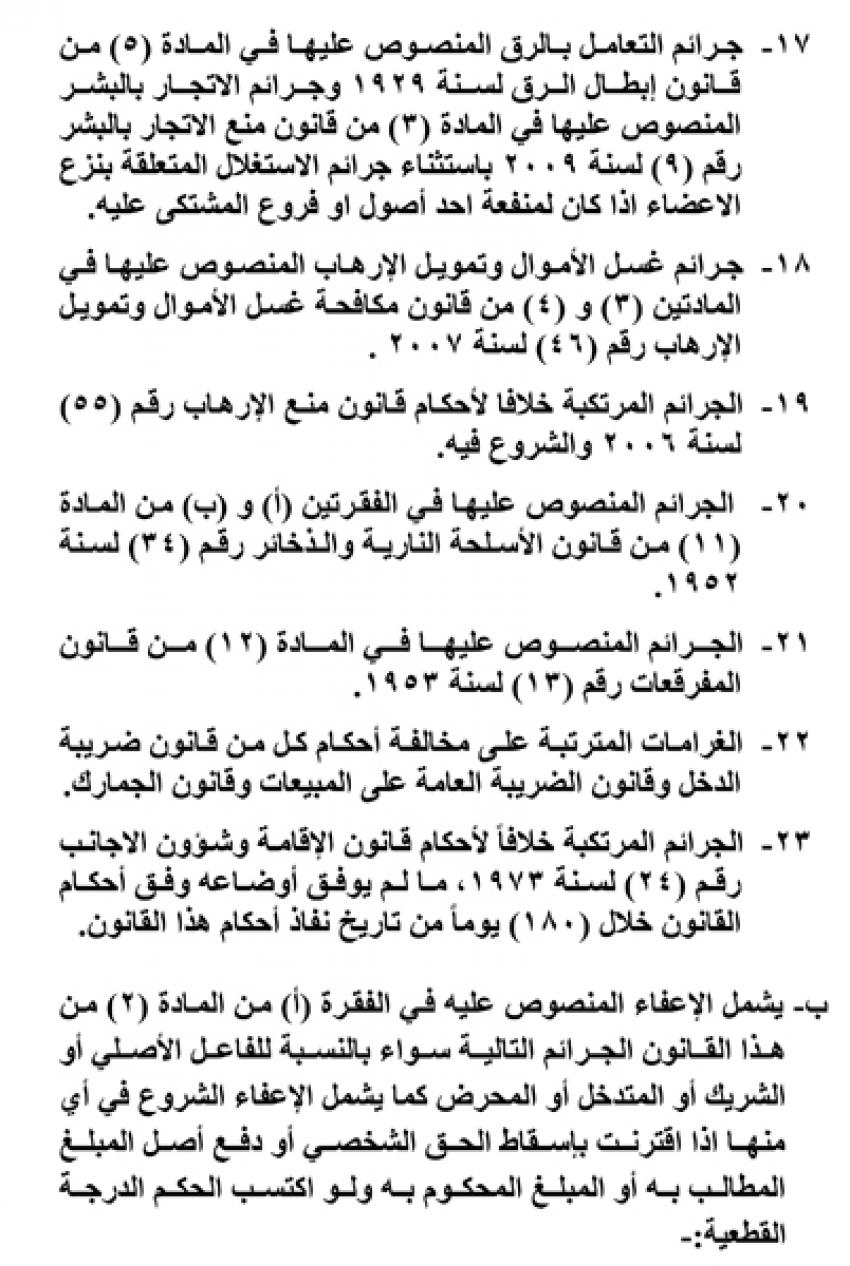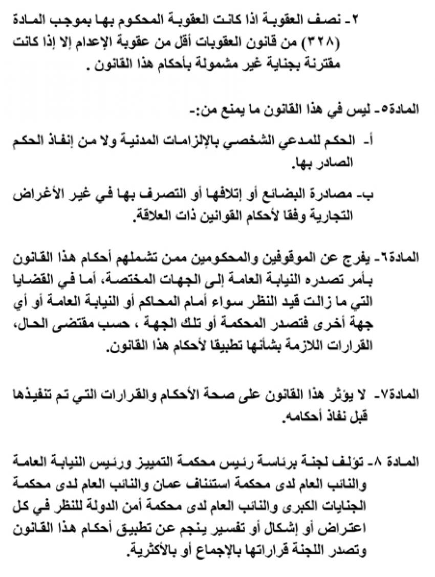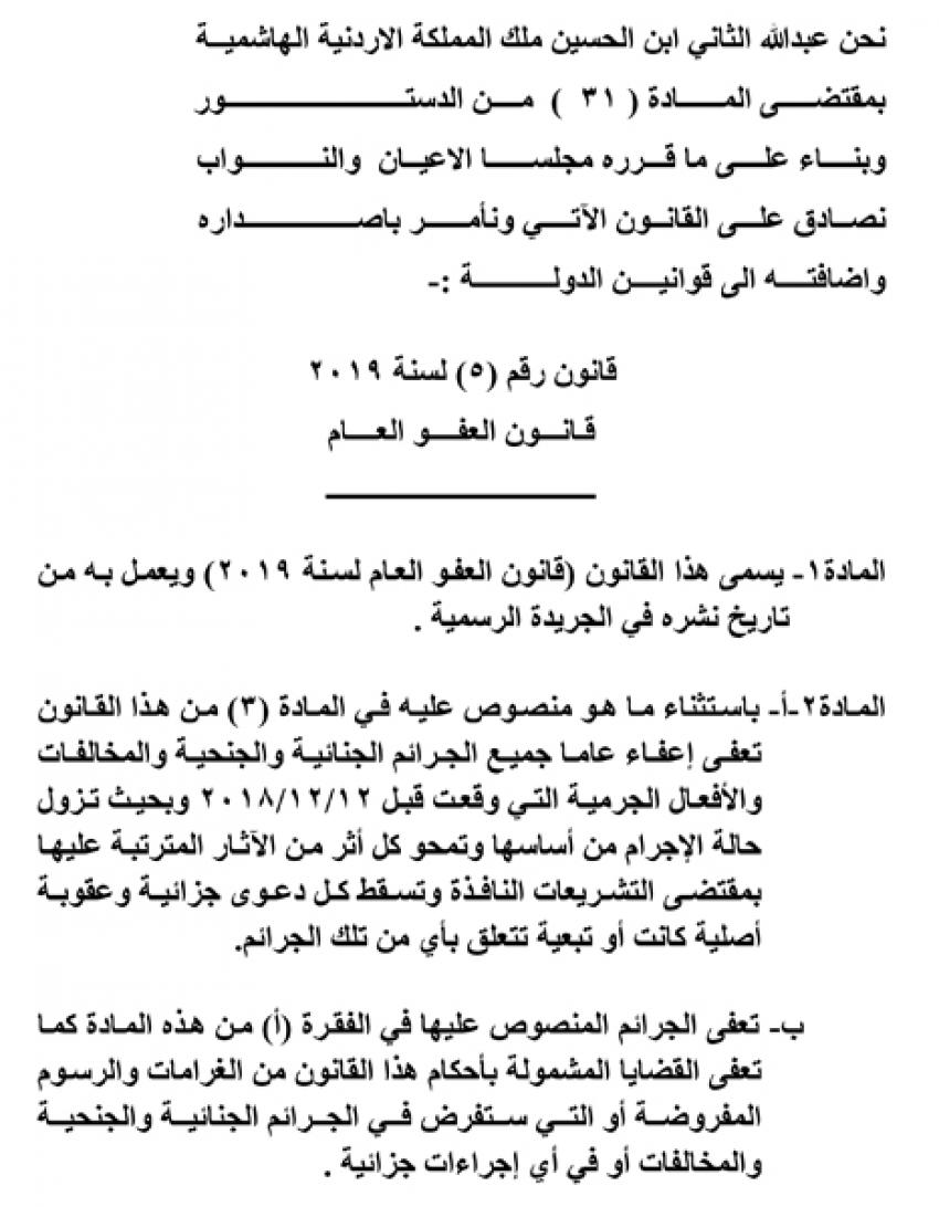 سرايا - دخل قانون العفو العام حيز التنفيذ بعد نشره في عدد خاص بالجريدة الرسمية صباح الثلاثاء.