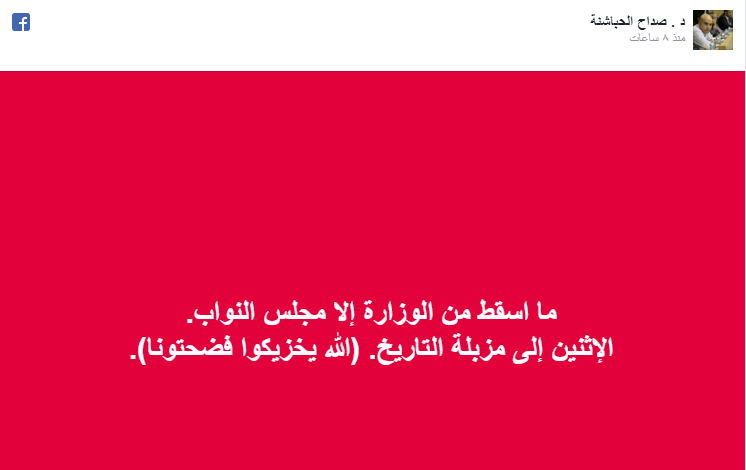 وعلق النائب الدكتور صداح الحباشنة، على هذه التعيينات عبر حسابه بموقع التواصل فيسبوك، قائلا : " ما اسقط من الوزارة إلا مجلس النواب، الإثنين إلى مزبلة التاريخ".