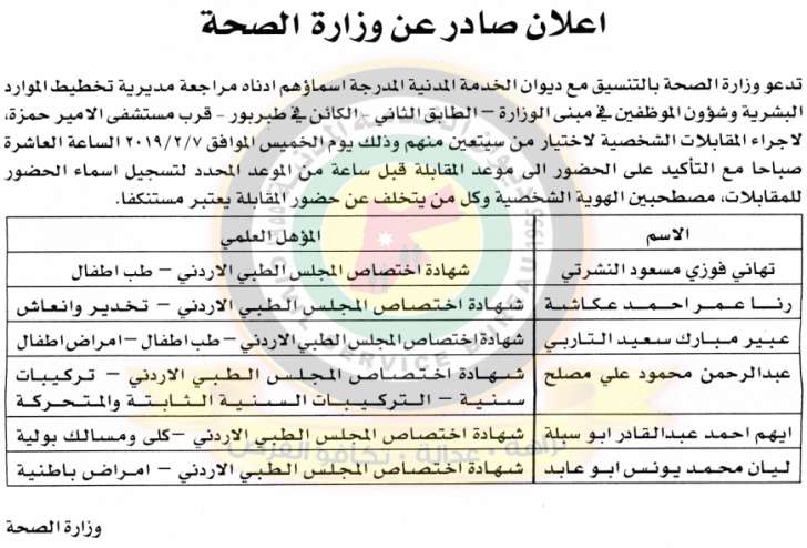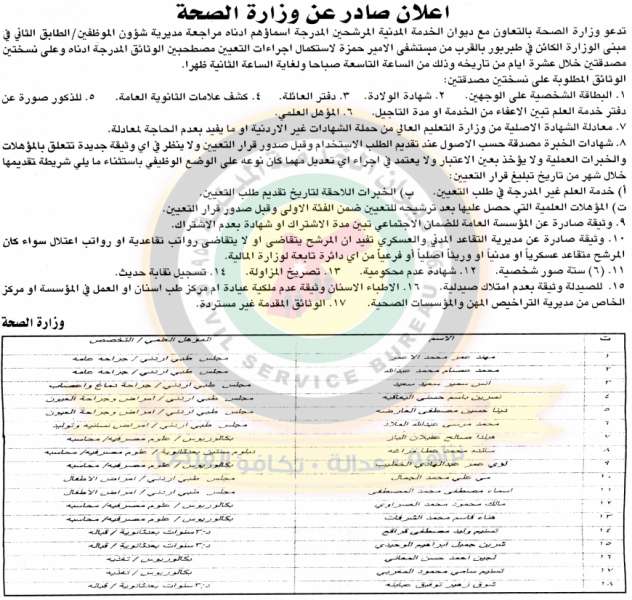 سرايا - تدعو وزارة الصحة بالتعاون مع ديوان الخدمة المدنية المرشحين المدرجة اسماؤھم ادناه مراجعة مديرية شؤون الموظفين /الطابق الثاني في مبنى الوزارة الكائن في طبربور بالقرب من مستشفى الامير حمزة الاستكمال اجراءات التعيين مصطحبين الوثائق المدرجة ادناه على نسختين مصدقتين خلال عشرة ايام من تاريخه.