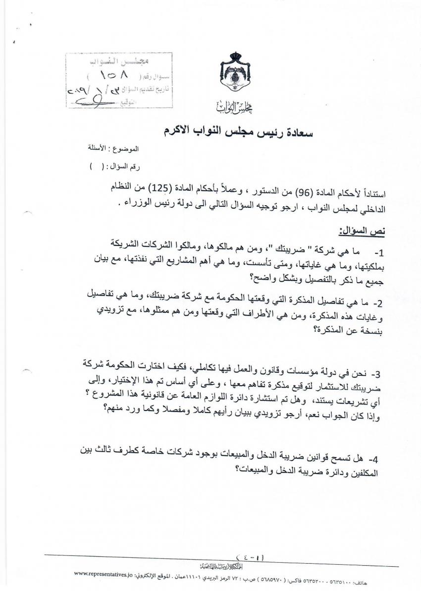 كشف سؤال نيابي وجهته النائب ديمة طهبوب عن توقيع الحكومة عبر وزارة الاتصالات ودائرة ضريبة الدخل والمبيعات لمذكرة تفاهم مع شركة خاصة ليتم تقديم الاقرارات الضريبية من خلالها، وطلبت النائب طهبوب من الحكومة إجابتها عن الكلفة التي سيتحملها المواطن جراء ذلك، وعن تناقض الاتفاق مع بنود قانونية تنص على سرية معلومات المكلفين.