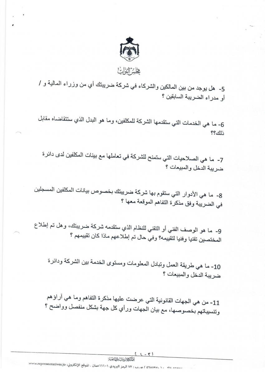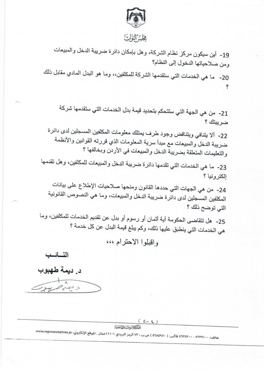 وأكدت النائب ديمة طهبوب أن الشركة التي وقعت الحكومة معها المذكرة باشرت طلب بيانات المكلفين من دائرة ضريبة الدخل، مشيرة أن خدمات دائرة ضريبة الدخل والمبيعات لا تحتاج لوجود أي جهة خاصة تكون طرفا ثالثا، وأن الخدمات متوفرة لجميع المكلفين، وأن التطوير على الخدمات لا يستدعي بأي حال التعاقد مع أي جهة غير مختصة لتكون وسيطا يقدم الخدمات للمواطنين.