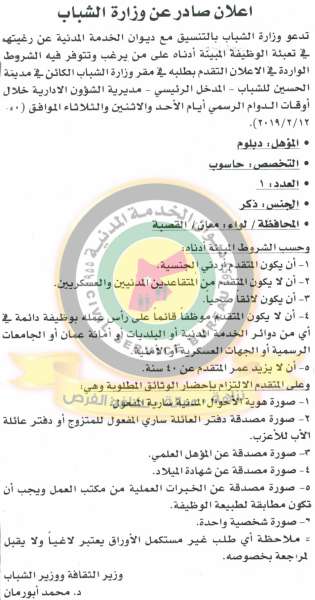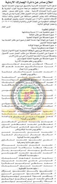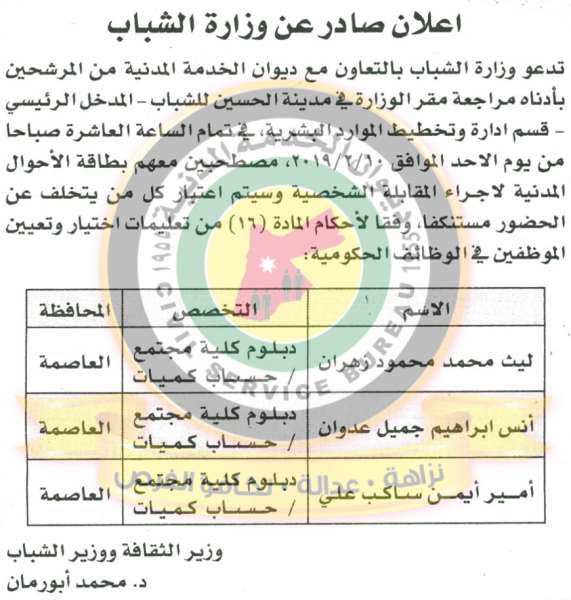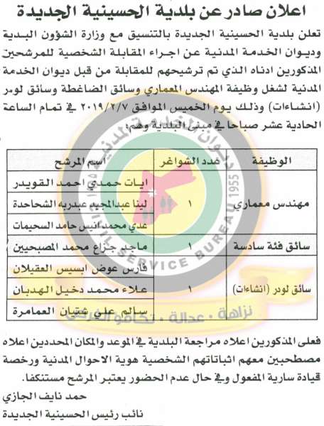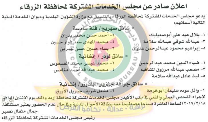 يدعو ديوان الخدمة المدنية بالتنسيق مع وزارة الشؤون البلدية (بلدية القويرة الجديدة,بلدية برقش),ووكالة الأنباء الأردنية (بترا), التالية أسماؤهم الذين انطبقت عليهم شروط الاعلان المنشور سابقا , التواجد يوم الخميس الموافق 14/2/2019الساعة 12 ظهرا في مبنى ديوان الخدمة المدنية الكائن في طبربور- شارع الاقصى وذلك لحضور الامتحان التنافسي الالكتروني كما هو موضح أدناه .