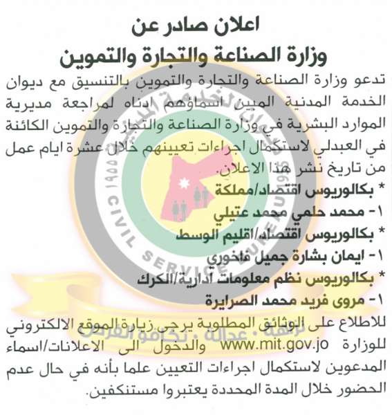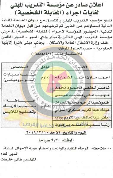 سرايا - دعا ديوان الخدمة المدنية بالتعاون مع مختلف الوزارات والمؤسسات الحكومية، التالية اسماؤهم لاجراء المقابلات الشخصية وعقد الامتحان التنافسي لغايات التعيين.