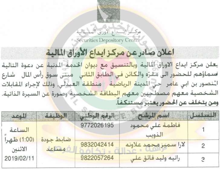 سرايا - دعا ديوان الخدمة المدنية بالتعاون مع مختلف الوزارات والمؤسسات الحكومية، التالية اسماؤهم لاجراء المقابلات الشخصية وعقد الامتحان التنافسي لغايات التعيين.