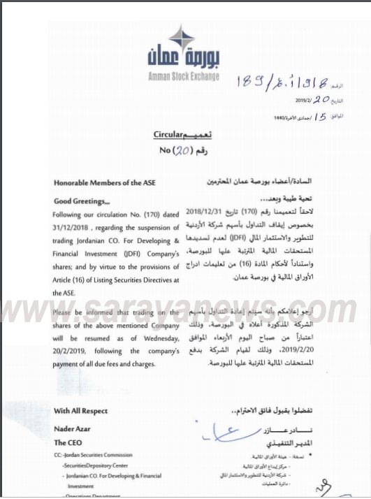 سرايا - خاص- أعادت بورصة عمّان اليوم الأربعاء 20/2/2019 تداول شركة الأردنية للتطوير والاستثمار المالي بعد تسديد المستحقات المالية المترتبة عليها للبورصة بحسب تعميم صدر عن المدير التنفيذي نادر عازر.
