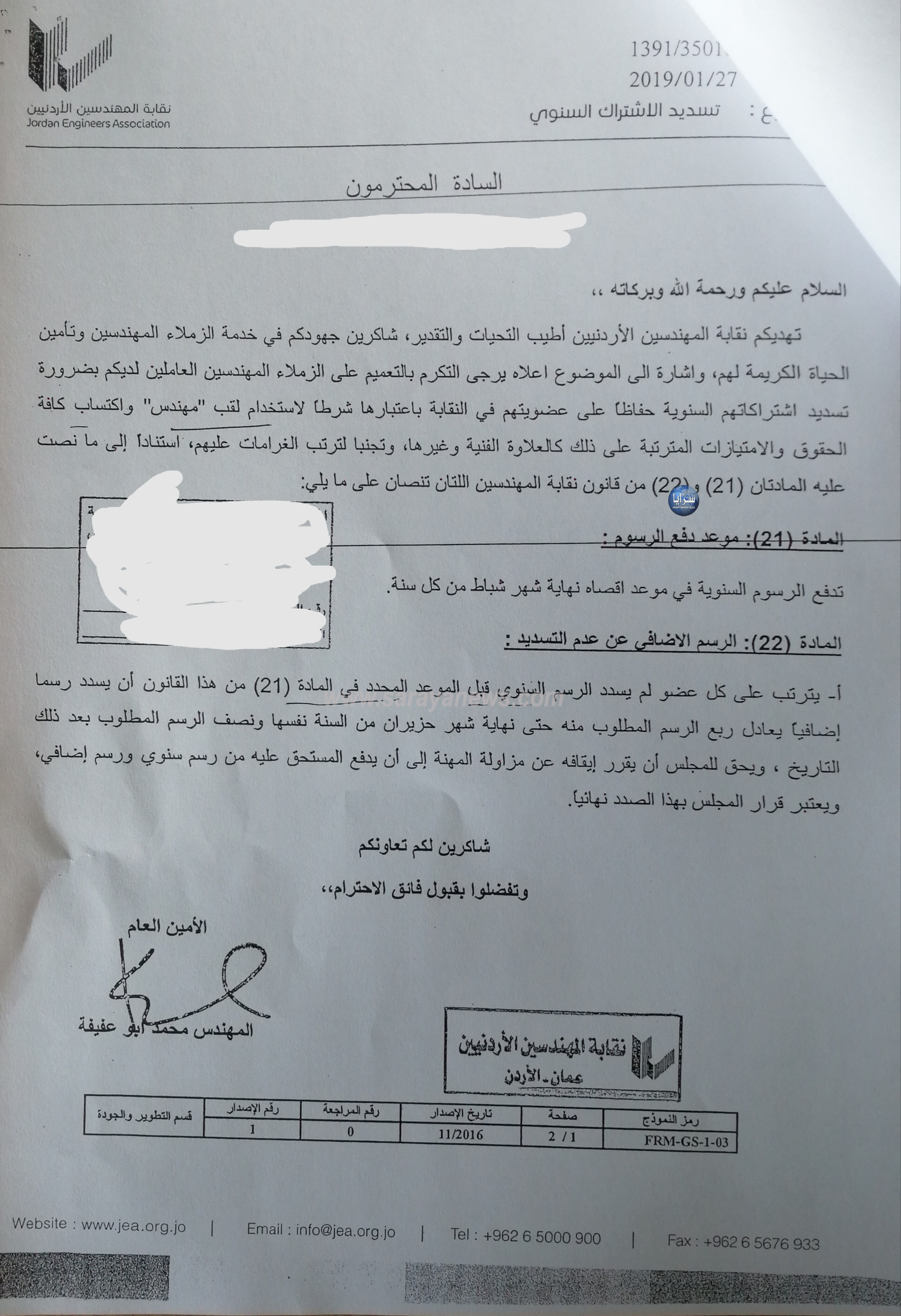 سرايا - امل العمر-اشتكى العشرات من المهندسيين من تعميم نقابة المهندسيين على المنتسبين بضرورة تسديد اشتراكاتهم السنوية.