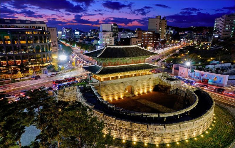 في عام 1869 كان هناك أربع بوابات كبيرة وأربعة صغيرة موجودة على جدار قلعة سيول وتم بناء هذه البوابات في كافة الاتجاهات وذلك لحماية المدينة من قوات الأعداء والحيوانات المفترسة، ونقش المعماريون على كل بوابة أحرفاً تعبر عن الكمال، والعدالة، واللباقة والحكمة، ويوجد على إحدى البوابات لوح الحجر”Dongdaemun ” والذي كان الاعتقاد السائد أنه يعزز من طاقة الأرض أمام البوابة، وتعدّ بوابة الحجر الآن أقدم بوابة رئيسية متبقية في سيول بعد أن دمر حريق ضخم باقي البوابات في العاشر من تشرين عام 2008.