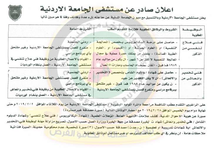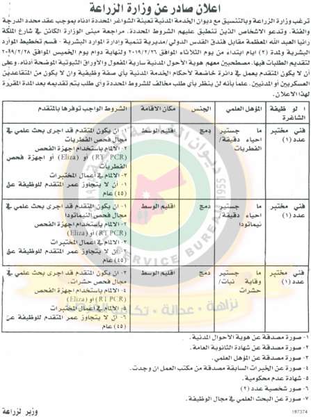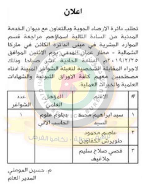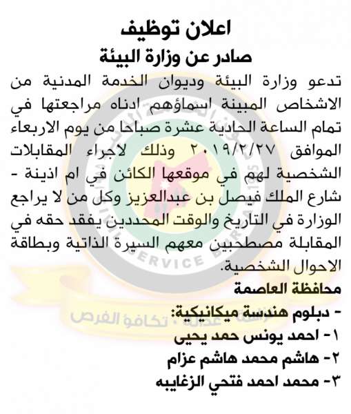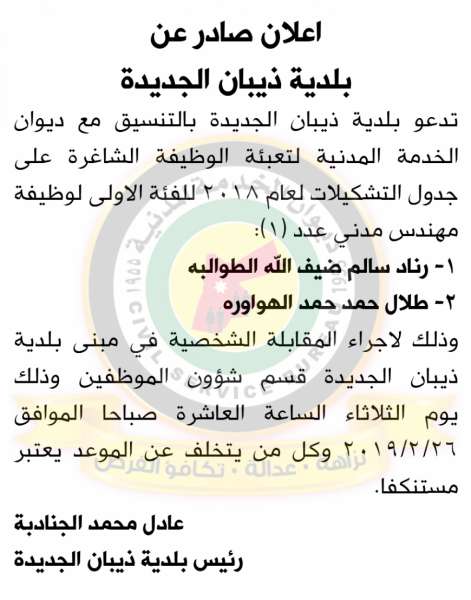 يدعو ديوان الخدمة المدنية بالتنسيق مع وزارة البيئة، وزارة الشؤون البلدية (بلدية مادبا الكبرى، بلدية السلط الكبرى، بلدية إربد الكبرى، بلدية عجلون الكبرى، بلدية المفرق الكبرى، بلدية الطفيلة الكبرى، بلدية الجيزة الجديدة، بلدية شرحبيل بن حسنة، بلدية الشعلة، بلدية معاذ بن جبل، بلدية الأزرق، بلدية القطرانة، بلدية عي، بلدية الشونة الوسطى)، بنك تنمية المدن والقرى، الجامعة الألمانية الأردنية، التالية أسماؤهم التواجد يوم الخميس الموافق 2019/2/28، الساعة 12 ظهراً في مبنى ديوان الخدمة المدنية الكائن في طبربور/ شارع الأقصى، لحضور الامتحان التنافسي الإلكتروني حسب الموضح أدناه.