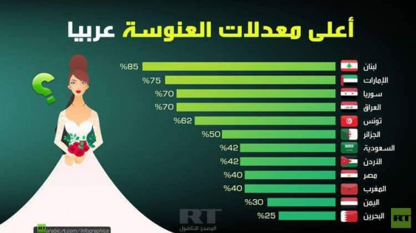 ويأتي لبنان في المقدمة بين الدول العربية حيث بلغ معدل العنوسة 85% حسب آخر الدراسات، وتلته الإمارات بنسبة 75%، ومن ثم كل من سوريا والعراق بنسبة 70%.