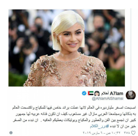 فقد علقت على أحد الحسابات التي نشرت الخبر على موقع "تويتر" بتغريدة جاء فيها: "أصبحت أصغر مليارديرة في العالم لأنها عملت "براند" خاص فيها للمكياج واكتسحت العالم به، بذكائها".
