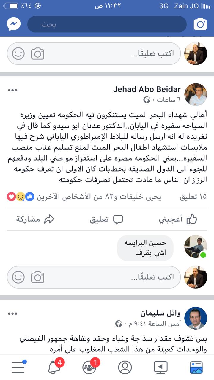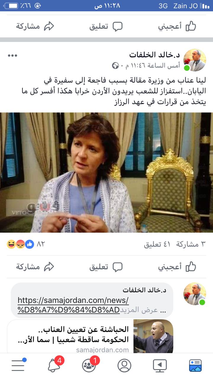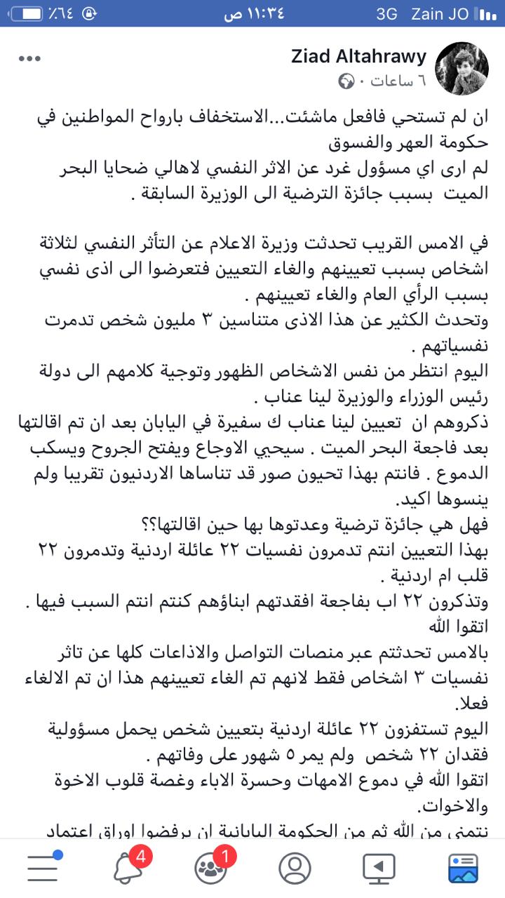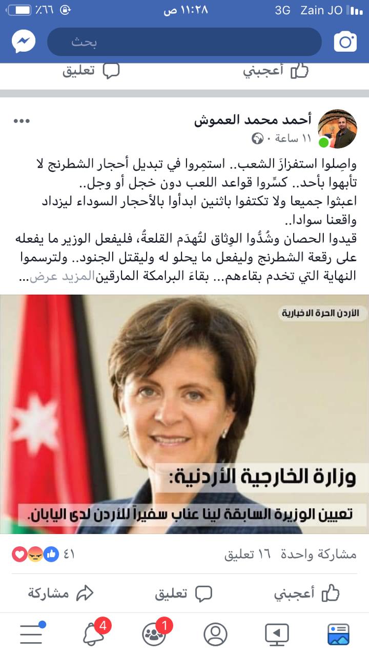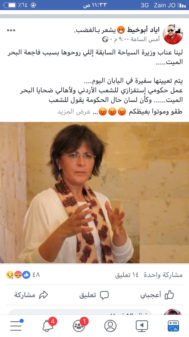سرايا - رصد - اجتاحت وسائل التواصل الاجتماعي والمواقع الالكترونيه عاصفة غضب غير مسبوقه بعد الكشف عن قيام الحكومه بالتنسيب باسم وزيرة السياحه السابقه لينا عناب سفيره للاردن في اليابان بعد ان كانت قد قدمت استقالتها كعقوبة على مسؤوليتها عن فاجعة البحر الميت .