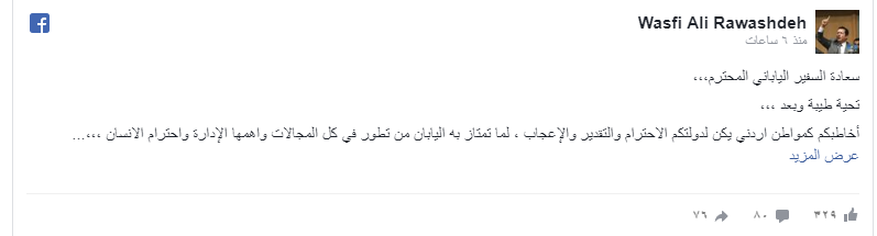 سرايا - نشر النائب الأسبق المهندس وصفي الرواشدة عبر صفحته الشخصية في فيسبوك ، رسالة الى السفير الياباني في الاردن ، حوا استمزاج الحكومة الأردنية للحكومة اليابانية لتعيين الوزيرة السابقة لينا عناب سفيرة اردنية في اليابان ، وذلك للتوضيح للحكومة اليابانية ، عن حالة غضب الشعب الاردني على قرار الحكومة ، بسبب اقالتها من كوزيرة للسياحة قبا اشهر على خلفية فاجعة البحر الميت ، وعدم احترام الحكومة الاردنية لمشاعر ذوي الضحايا .