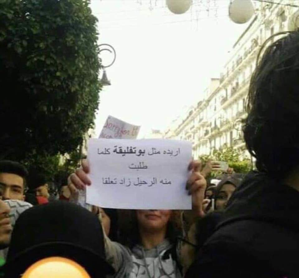 سرايا - تفنّن المتظاهرون الجزائريون الذين امتلأت بهم الساحات العامة والشوارع للأسبوع الثالث على التوالي في إبداع شعارات ولافتات غريبة وطريفة، لإيصال رسائلهم إلى النظام، والتعبير عن رفضهم لترشح الرئيس عبد العزيز بوتفليقة لولاية خامسة.
