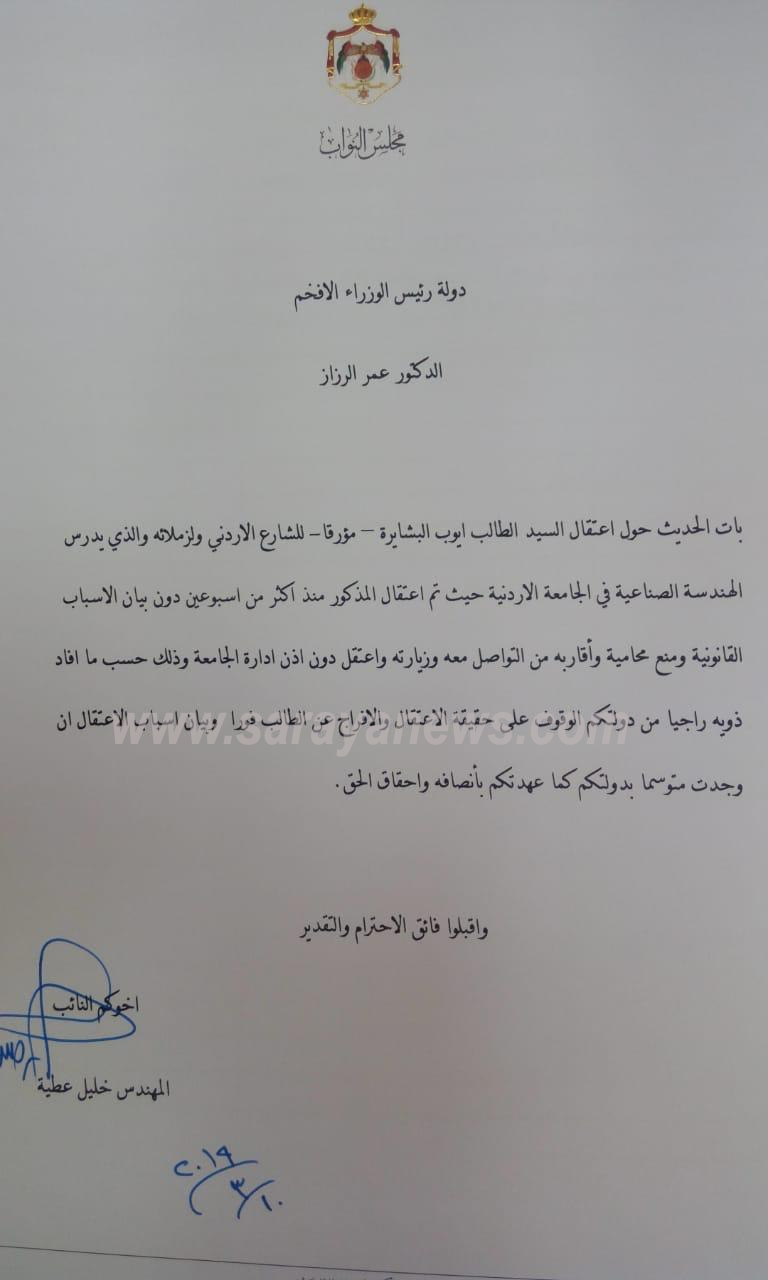 سرايا - سأل النائب خليل عطية عن اعتقال الطالب ايوب البشايرة والذي يدرس الهندسة الصناعية في الجامعة الاردنية "دون بيان الاسباب القانونية".