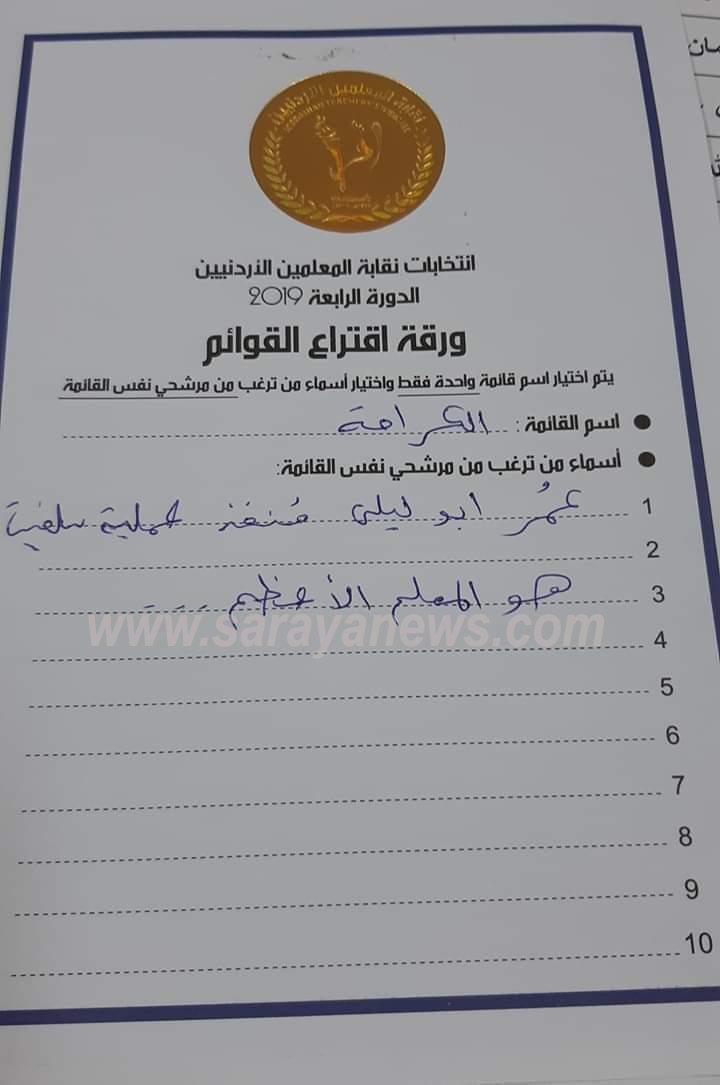 سرايا - رهام الخزاعلة - رصدت ورقة اقتراع تداولها نشطاء عبر شبكات التواصل الاجتماعي لانتخابات نقابة المعلمين كتب فيها احد الناخبين القائمة "الكرامة" المرشح عمر ابو ليلى .