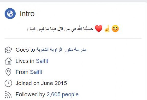 في بداية صفحته، كتب تعريفاً بسيطاً :" حسبُنا الله في من قال فينا ما ليس فينا"، أما معلوماته فذكر أنه من سلفيت ويدرس في مدرسة ذكور الزاوية الثانوية.