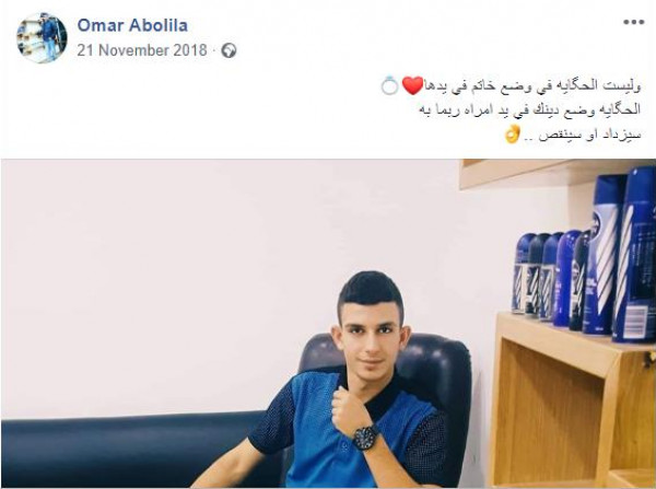 فلم يكتب منشورات عن الاحتلال، أو الأحداث التي تمر بها فلسطين بكافة مُدنها، سواء من اقتحامات الأقصى، أو الغارات الإسرائيلية على غزة، وغيرها، كما لم يتطرق للسياسة أبداً.