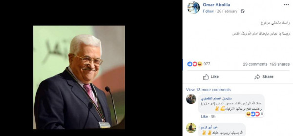 أما أحدث منشوراته، حين نشر صورة الرئيس عباس، وعلق عليها: "راسك بالعالي مرفوع، ريسنا يا عباس بايعناك امام الله وكل الناس".