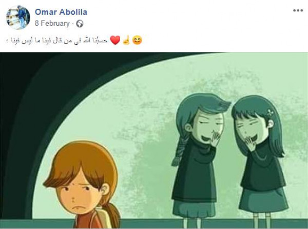 ومن المنشورات المثيرة للاهتمام، حين كتب: أنا عمري ما خفت من جمله " كما تدين تدان " او دعوة "ربنا يديني على قد نيتي" ..انا بتمنى كل الي بعمله مع ال حوليه او ال ف نيتي يتردلي والله العظيم ".