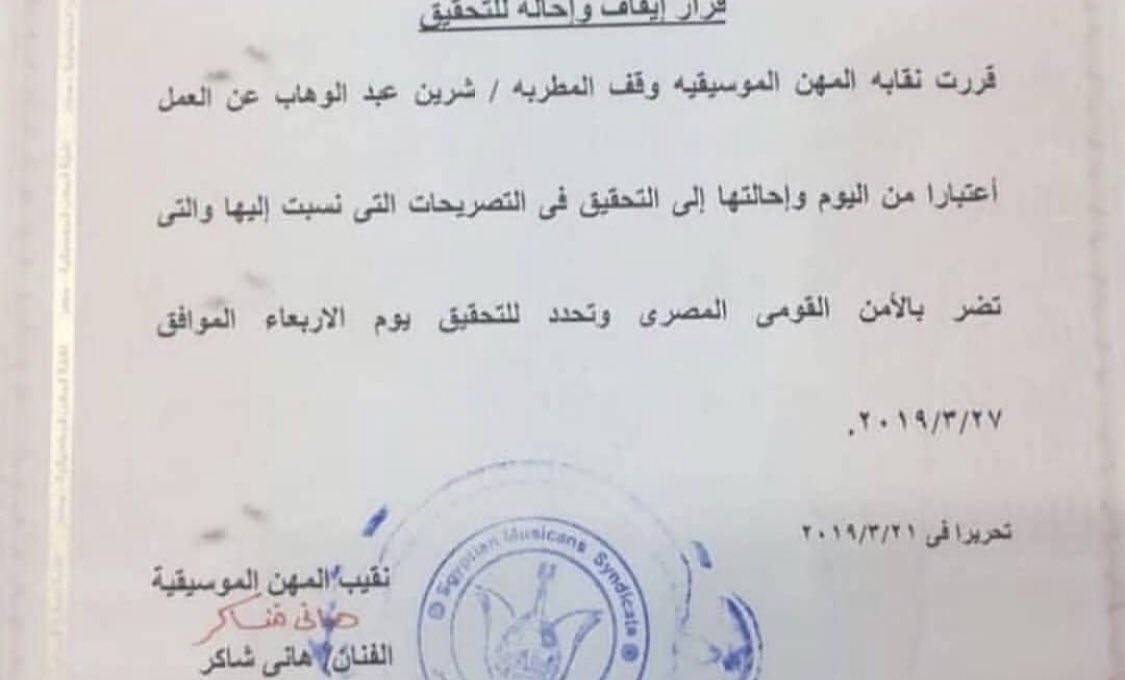 سرايا - خلال حفل لها بالبحرين قالت الفنانة شيرين عبد الوهاب:"أيوا كده أقدر أتكلم براحتي عشان في مصر اللي يتكلم بيتسجن"وهذه الجملة من فيديو سرّب لها كانت كفيلة بإصدار حكم بحقها يمنعها من الغناء وجاء الحكم كالتالي: