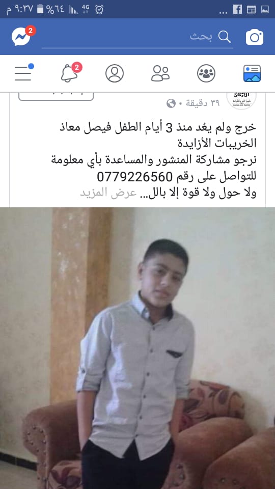 سرايا - خاص- اختفى الطفل فيصل معاذ عبد المنعم الخريبات الذي يبلغ من العمر 15 عاما بعد ذهابه الى المدرسة يوم الخميس الماضي وبعدها لم يعد الى منزله .