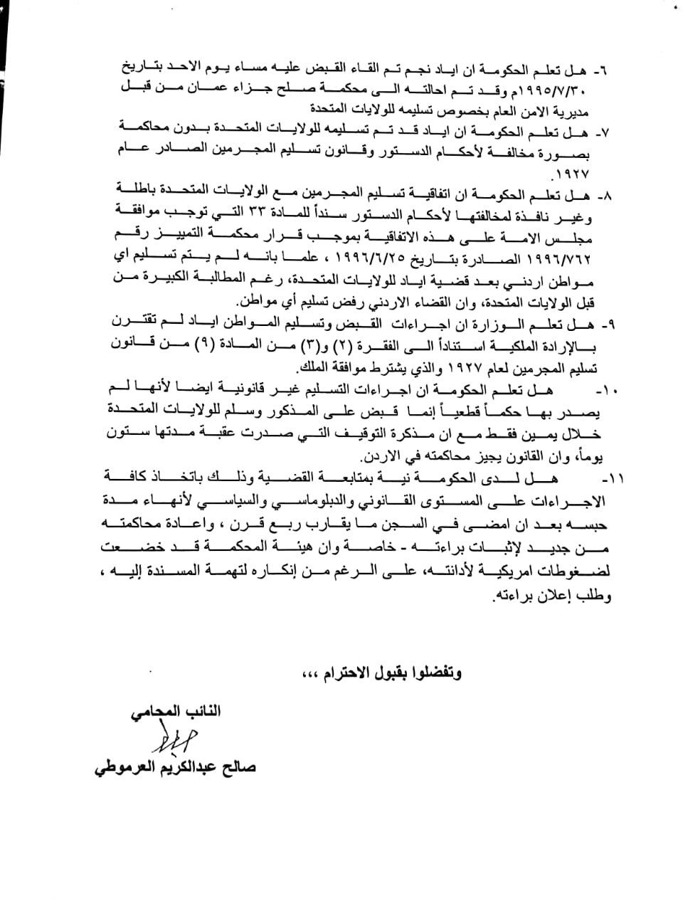 10- هل تعلم الحكومة ان اجراءات التسليم غير قانونية ايضا لأنها لم يصدر بها حكماً قطعياً إنما قبض على المذكور وسلم للولايات المتحدة خلال يمين فقط مع ان مذكرة التوقيف التي صدرت عقبة مدتها ستون يوماً، وان القانون يجيز محاكمته في الاردن.