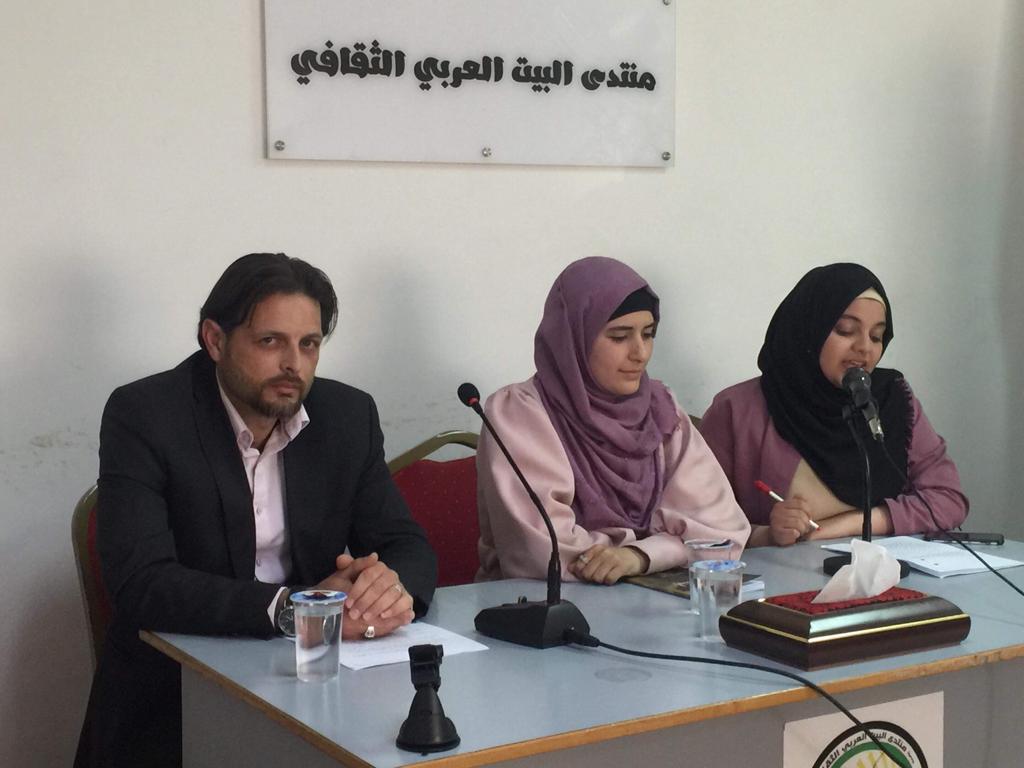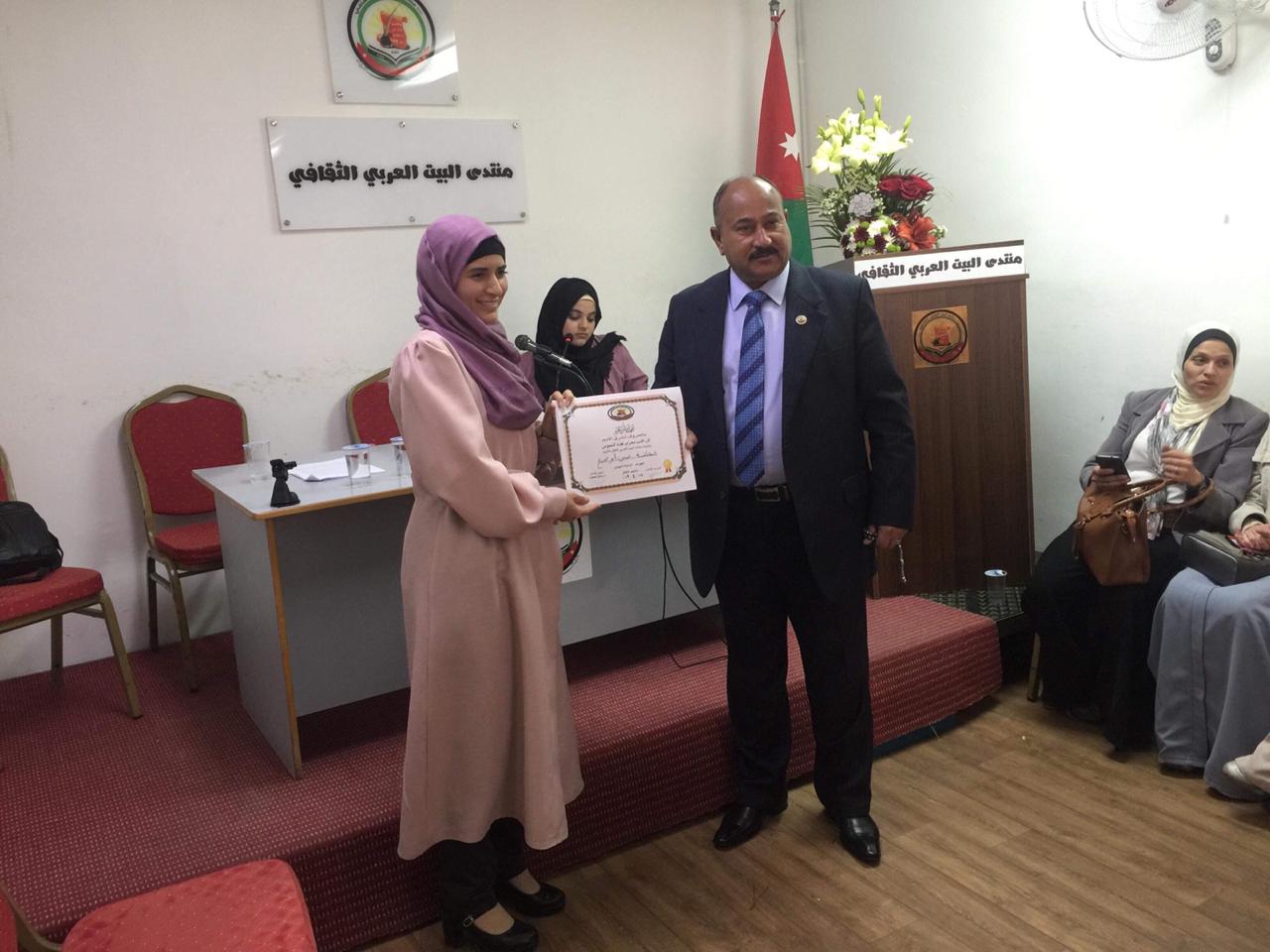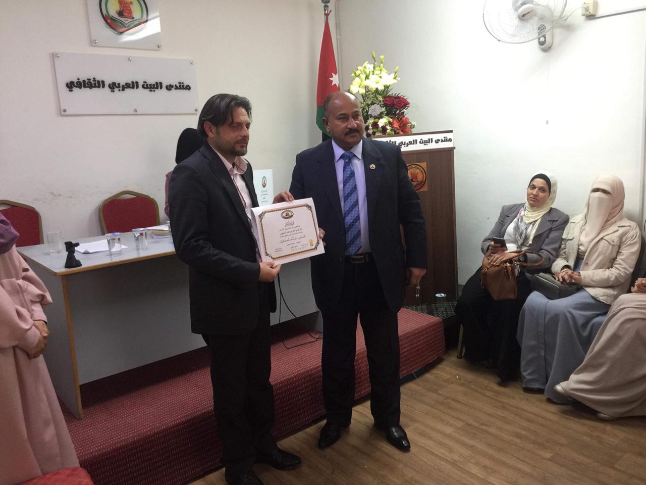 وفي نهاية الحفل كرم رئيس المنتدى الثقافي العربي صالح جعافرة بتكريم الكاتبة والروائية حنين ابو صبيح والشاعر والناقد خالد السبتي .