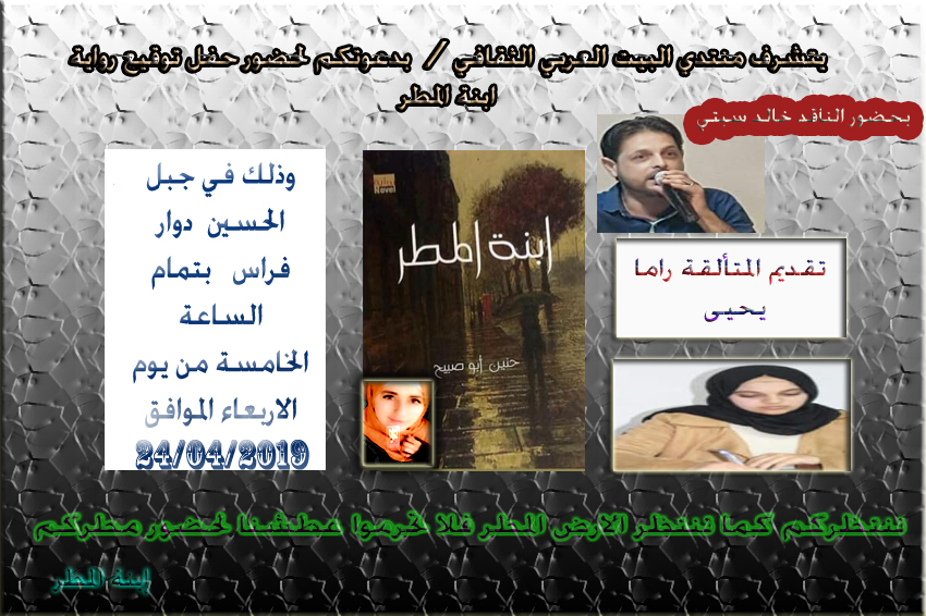 جرى في منتدى البيت العربي الثقافي في العاصمة عمان يوم الاربعاء 24/4/2019 حفل توقيع الاصدار الاول لرواية ابنة المطر من تاليف المعلمة والكاتبة الروائية حنين جمال ابو صبيح ، بحضور نخبة من المهتمين بالشأن الثقافي والادبي في الاردن .