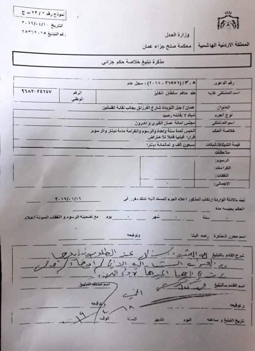 وتضمنت مذكرة المحكمة بالإضافة إلى حكم حبس الفايز غرامة 100 دينار وإقرارا غيابياً بالرسوم المترتبة على القضية.