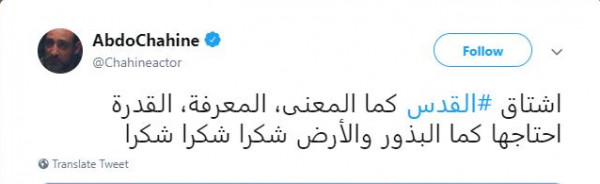 سرايا - تلقى الممثل اللبناني عبدو شاهين هدية مميزة من أحد متابعيه على مواقع التواصل الإجتماعي حيث قام بكتب اسم شاهين على ورقة، وصورها الى جانب المسجد الاقصى في فلسطين.