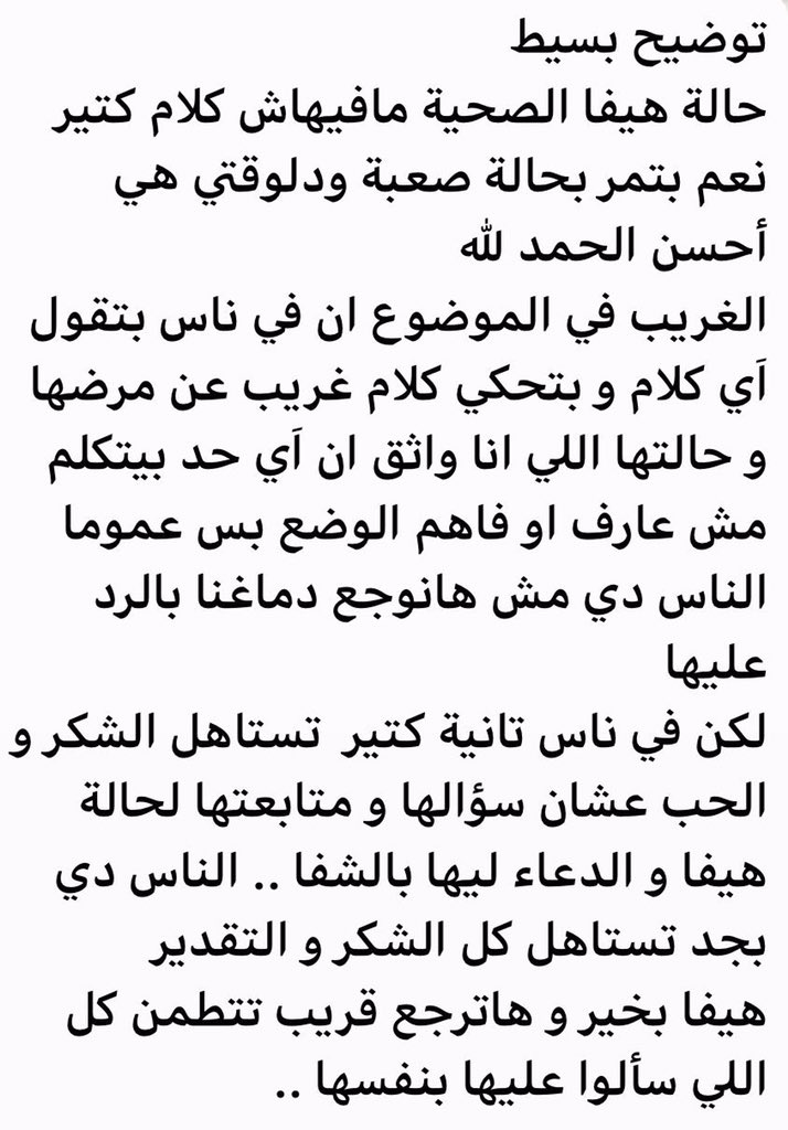 وأكد وزيري في تغريدة على "تويتر"، أن هيفاء تمر بظروف صحيّة صعبة إلا أن حالتها تتحسن كل يوم. وكتب وزيري: "توضيح بسيط حالة هيفا وهبي مفيهاش كلام كتير، نعم بتمر بحالة صعبة وهي أحسن دلوقتي"، وأضاف: "ظروف هيفا الصحيّة صعبة وكل يوم في تحسن".