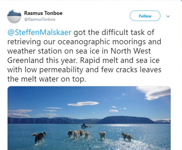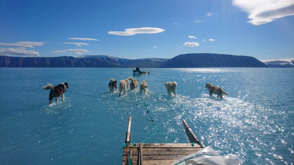 فقد التقط الباحث الدنمركي ستيفين أم سولين صورة لكلاب تجر مزلجة جليدية لكن ليس على الجليد، حيث تغوص أرجلها في المياه في مضيق بريدنينغ شمال غرب جزيرة غرينلاند المتجمدة، أو التي كانت كذلك قبل أيام.