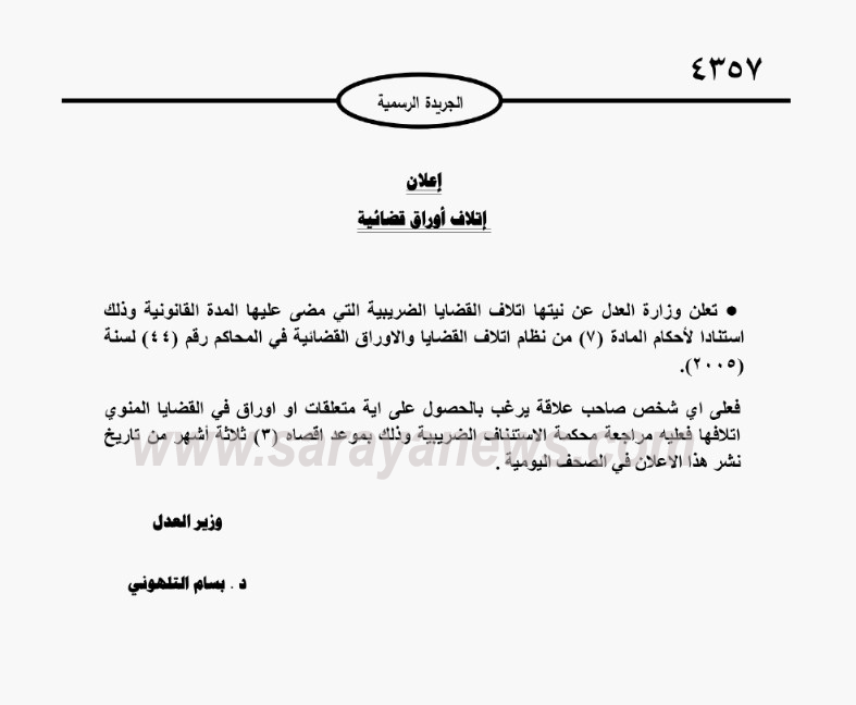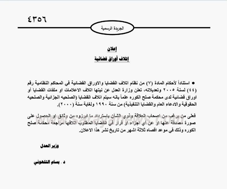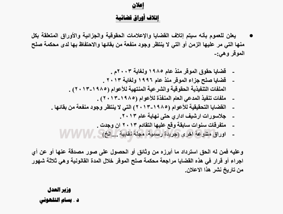 سرايا - حصلت سرايا على وثائق تبين ان وزارة العدل تعلن للعموم انه سيتم اتلاف القضايا والاعلامات الحقوقية والجزائية والاوراق المتعلقة بكل منها التي مر عليها الزمن او التي لا ينتظر وجود منفعة من بقائها والاحتفاظ بها لدى محكمة صلح الموقر .