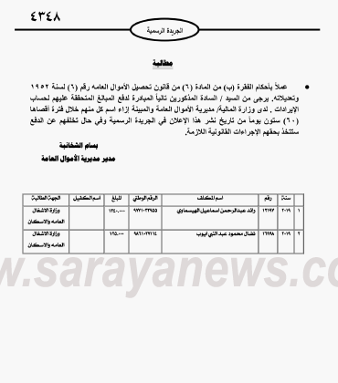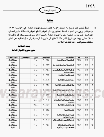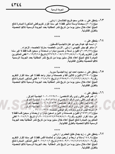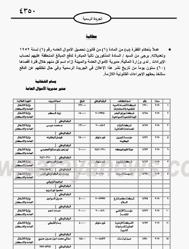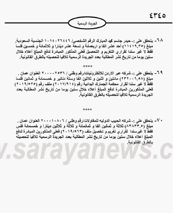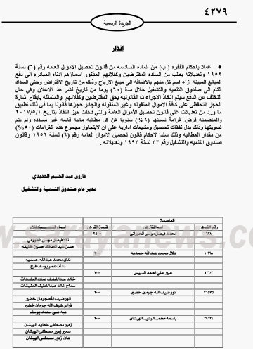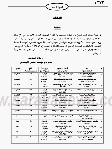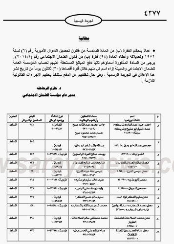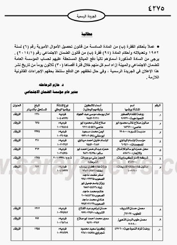 سرايا - دعت المؤسسة العامة للضمان الاجتماعي التالية اسماءهم دفع المبالغ المستحقة عليهم لحساب "الضمان " خلال فترة اقصاها 30 يوماً من تاريخ نشر الاعلان .وأكدت انه بحال التخلف عن الدفع سيتم اتخاذ الاجراءات القانونية اللازمة بحقهم .وتالياً الاسماء :