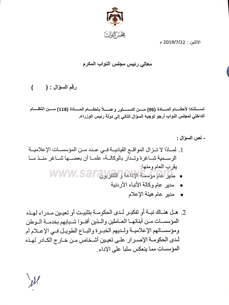 سرايا - وجه النائب صالح العرموطي سؤالا نيابيا للحكومة حول المواقع القيادية الشاغرة في عدد من المؤسسات الإعلامية الرسمية.
