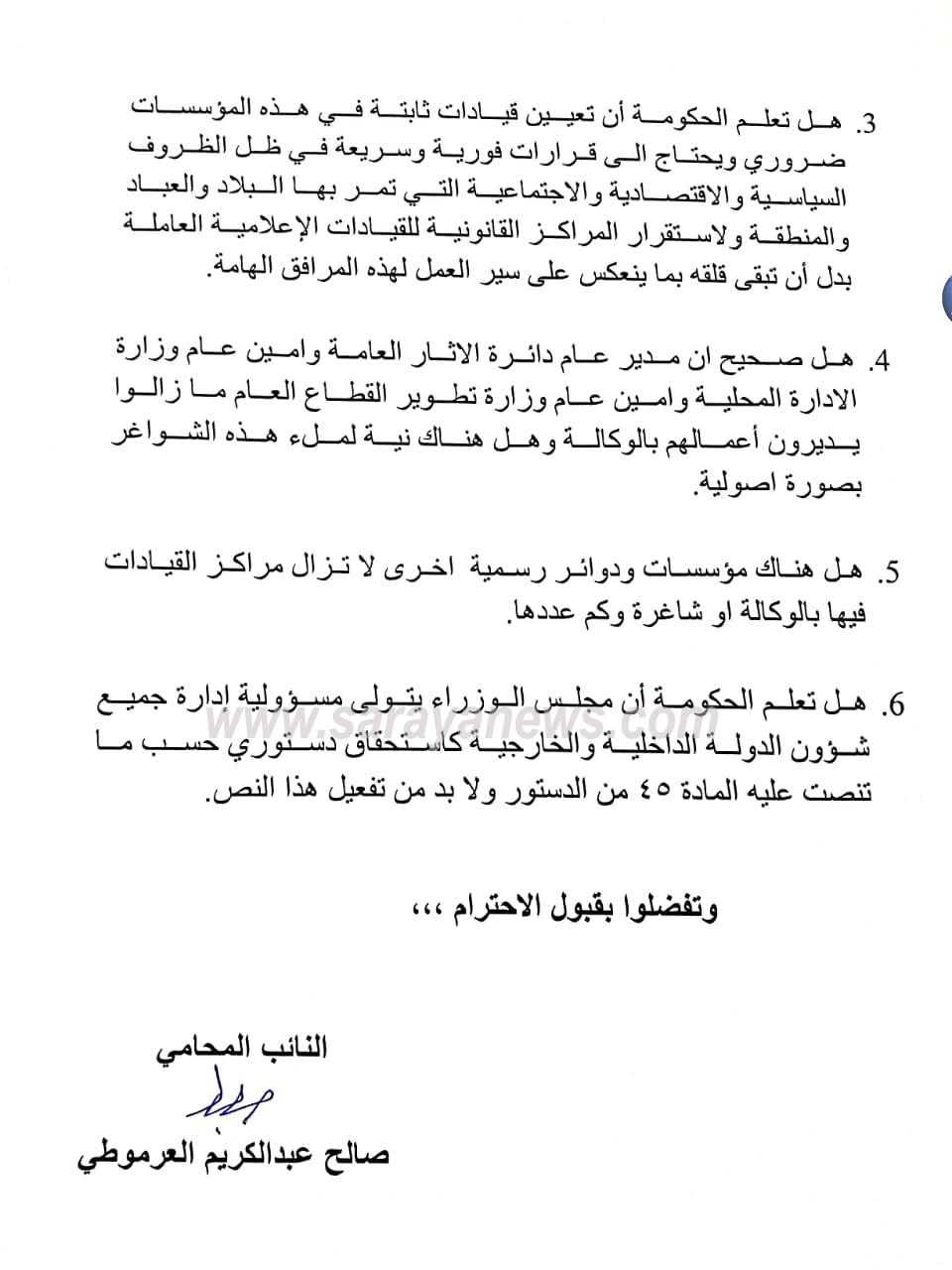 5. هل هناك مؤسسات ودوائر رسمية اخرى لا تزال مراكز القيادات فيها بالوكالة او شاغرة وكم عددها.