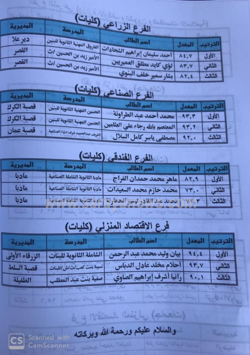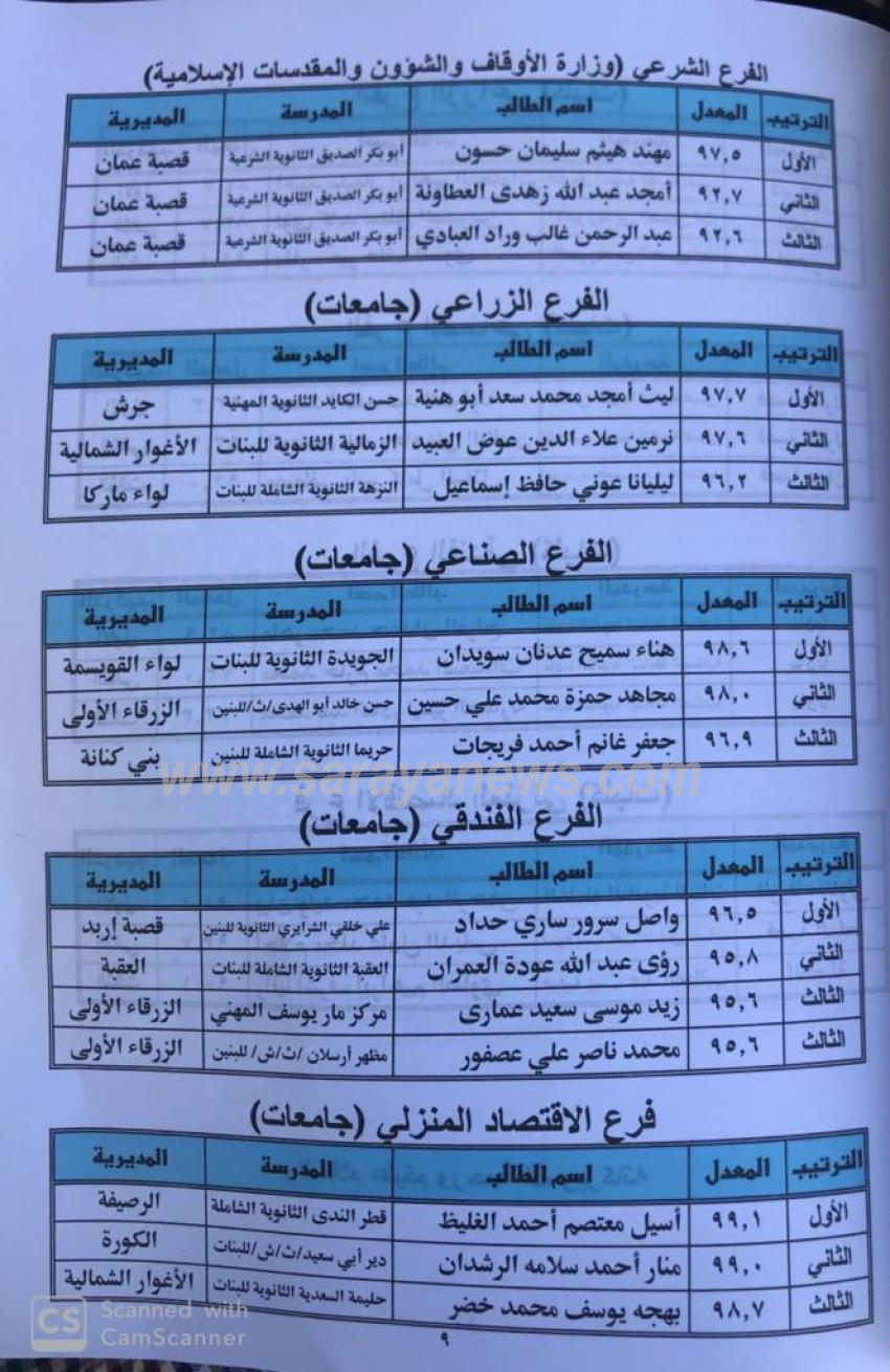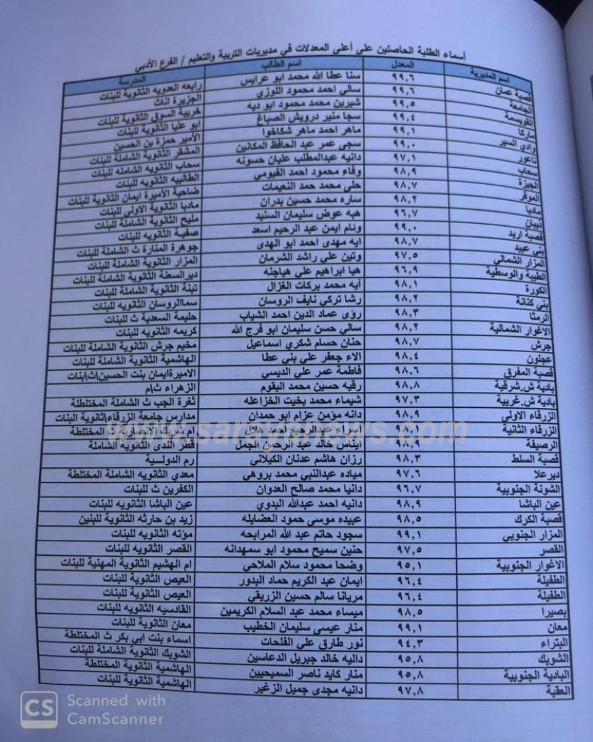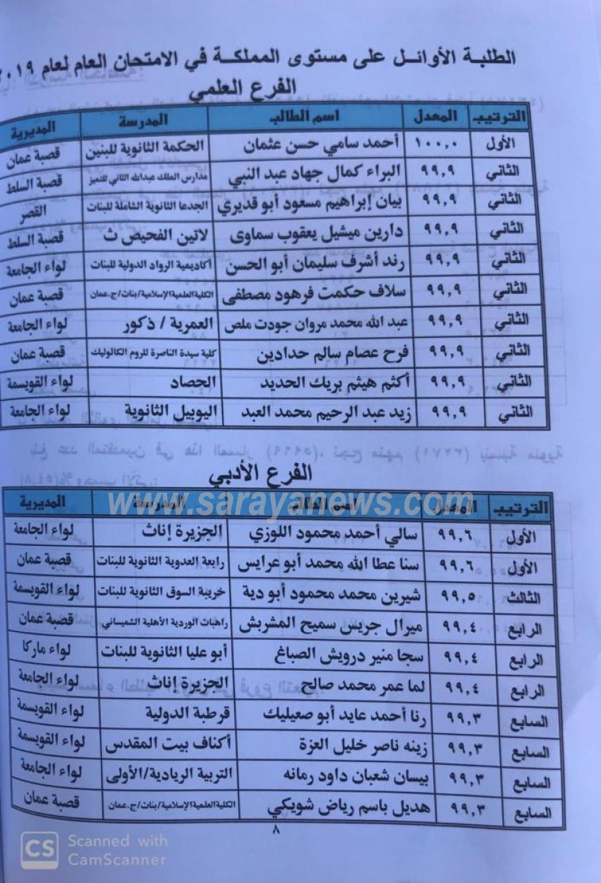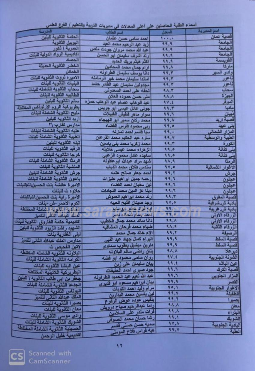 ولأول مرة بتاريخ المملكة حصل الاول على الفرع العلمي على معدل 100%، فيما حصل الطلاب الـ 9 البقية من العشرة الاوائل على معدل 99.9%.
