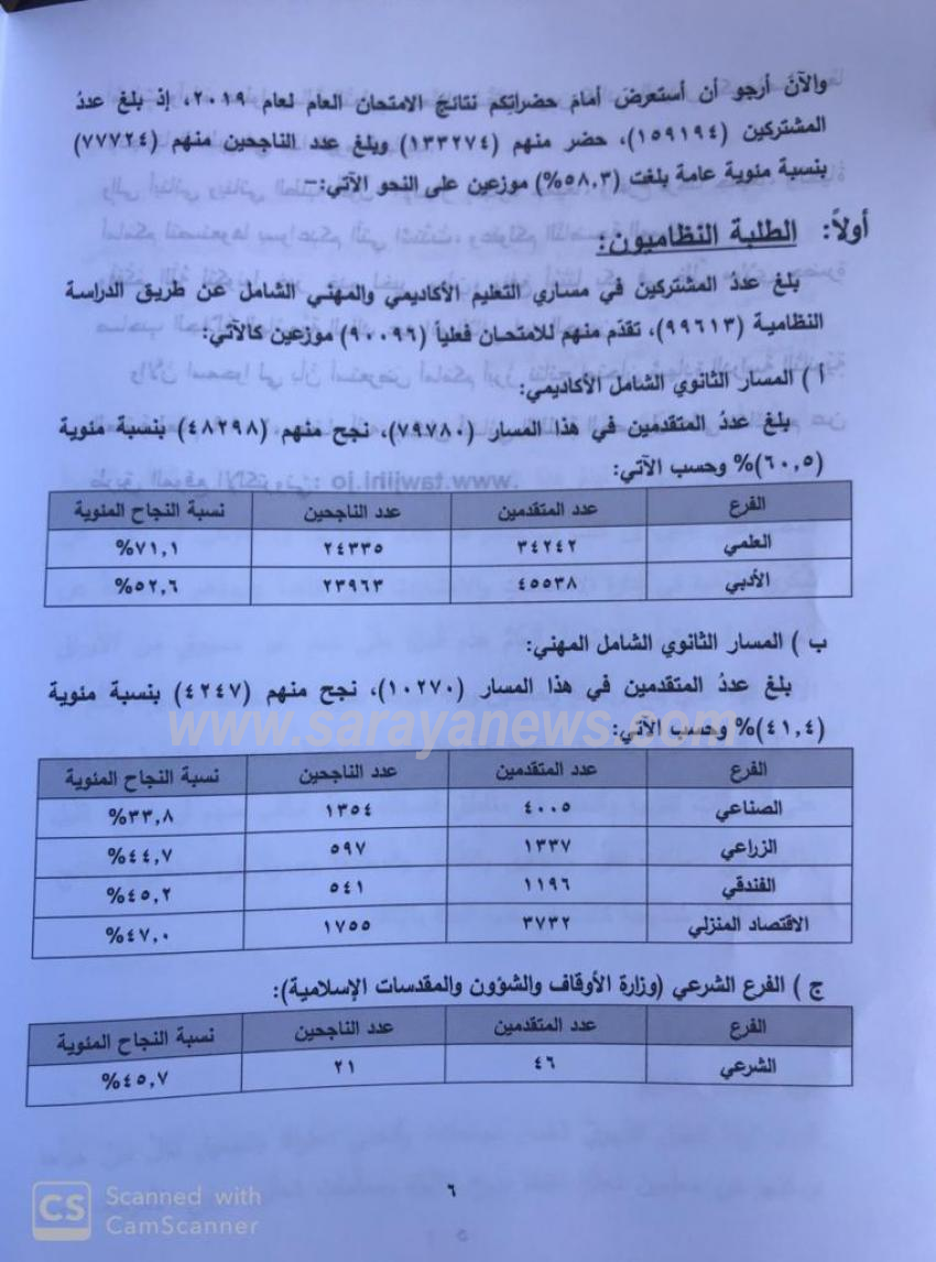 وقال المعاني خلال مؤتمر صحفي عقده الخميس، إن نسبة النجاح بالفرع العلمي بلغت 71.1%، فيما بلغت نسبة النجاح بالفرع الادبي بلغت 65.5%.