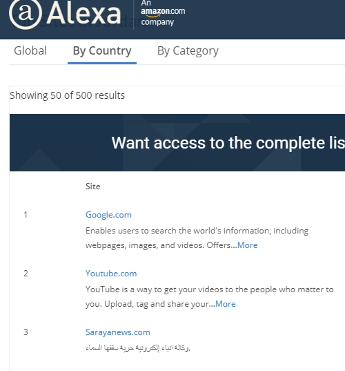 سرايا - أصدر موقع ألكيسا (ALEXA) العالمي الشهير المتخصص في إحصائيات و ترتيب مواقع الأنترنت حول العالم ، مجدداً نشرته لشهر تموز يوليو 2019 ، حول ترتيب المواقع و حصلت سرايا على المرتبة الاولى بين المواقع الإخبارية و الثالثة بين مواقع الانترنت في الاردن ، حيث حل موقع 'جوجل' أولاً على المملكة و 'يوتيوب' ثانياً و 'سرايا' ثالثاً تاليا رابط الموقع : Top Sites in Jordan - Alexa ، حيث اظهرت دراسات غوغل انالاتيك بان عدد مشاهدات سرايا اليوميه (2.5) مليون مشاهده.