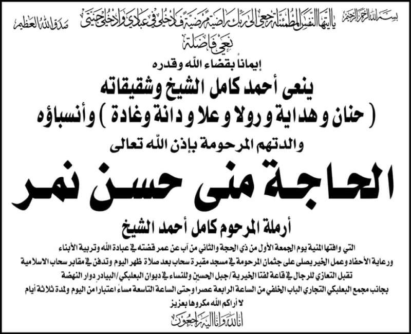 تقبل التعازي في قاعة لفتا الخيرية / جبل الحسين، وللنساء في ديوان البعلبكي / البيادر / دوار النهضة / بجانب مجمع البعلبكي التجاري / الباب الخلفي، من الساعة الرابعة عصرا وحتى الساعة التاسعة مساء ولغاية مساء يوم الاثنين.