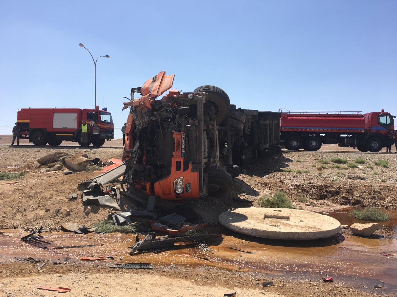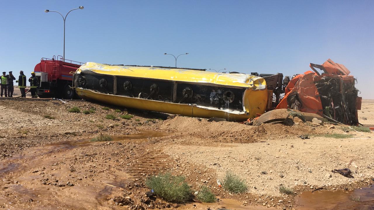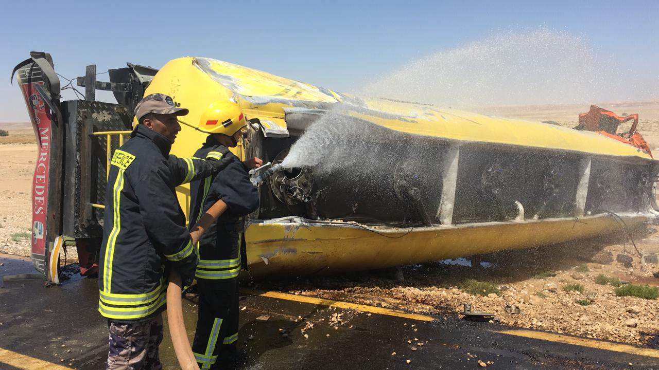 سرايا - قالت إدارة الإعلام في الدفاع المدني أن كوادر الإنقاذ والإسعاف في مديرية دفاع مدني الكرك تعاملت اليوم مع حادث تدهور صهريج محمل بمادة وقود الطائرات تقدر حمولته بـ(40 طن) بمنطقة السلطاني , مما أدى إلى محاصرة السائق داخل مقصورة الصهريج وانسكاب بسيط من المادة المحملة بجانب الطريق.