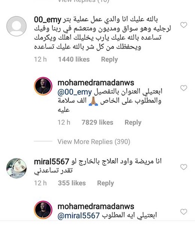 ونشر رمضان صورة من إجازته في أميركا، لتُعلِّق الفتاة عليها قائلة: "أنا مريضة وأودّ العلاج بالخارج لو تقدر تساعدني"، وردّ عليها محمد رمضان قائلاً: "ابعتيلي إيه المطلوب والبيانات الكاملة على الخاص".
