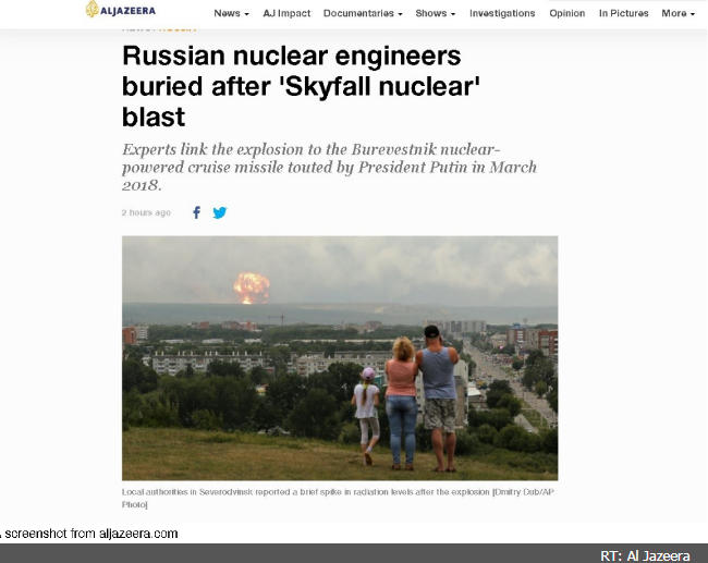 ونشرت وكالة AP الإخبارية صورة تظهر أسرة روسية وهي تنظر لانفجار وقع في مخزن للذخيرة، ووضعت الصورة في رأس خبر يتحدث عن انفجار حدث في موقع روسي لاختبار المحركات النووية، أعلنت عنه روسيا رسميا في 5 أغسطس الجاري، مما أثار موجة من الشائعات والأكاذيب التي تلقفتها أوساط الإعلام الغربي.