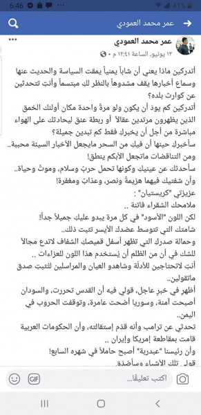 تحدثي عن ترامب وأنه قدّم إستقالته، وأن الحكومات العربية قامت بمقاطعة إمريكا وإيران ..