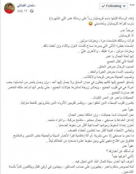 وقال نشطاء أن كريستيان ردت بنص أجمل، لكن الحقيقة، حين تتبعت "دنيا الوطن" حساب الشاعر الرسمي، وجدت أن الرد المنسوب لكريستيان غير صحيح، بل هو رد شاعر يمني آخر يُدعى سلمان القابلتى، الذي تقمص شخصية المذيعة ورد بنص لا يقل جمالاً عن نص زميله العمودي.