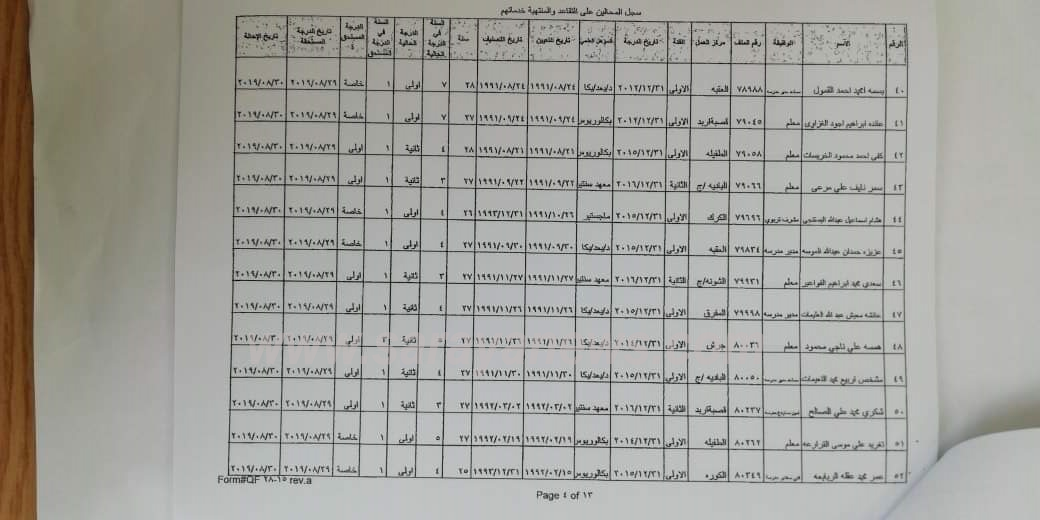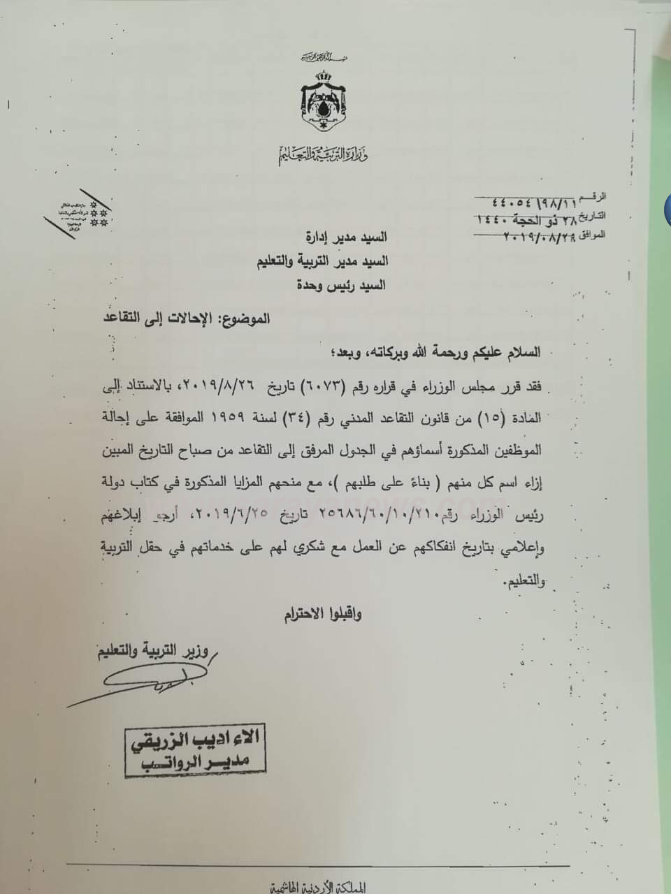 سرايا - قرر مجلس الوزراء في جلسته المنعقدة بتاريخ 26/8/2019 الموافقة على إحالة عدد من الموظفين في وزارة التربية إلى التقاعد .
