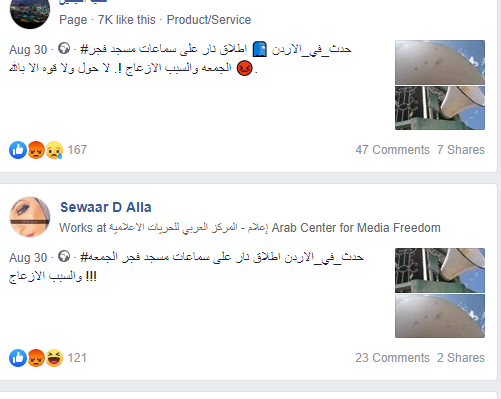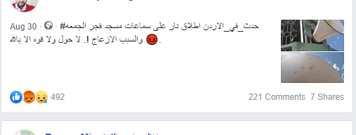 وادعت بعض الصفحات أن هذه الحادثة حصلت في الأردن، وكانت بسبب انزعاج أحد المواطنين من صوت آذان الفجر، فما كان منه إلا أن يُحاول إسكات الصوت بإطلاق النار على السماعات.